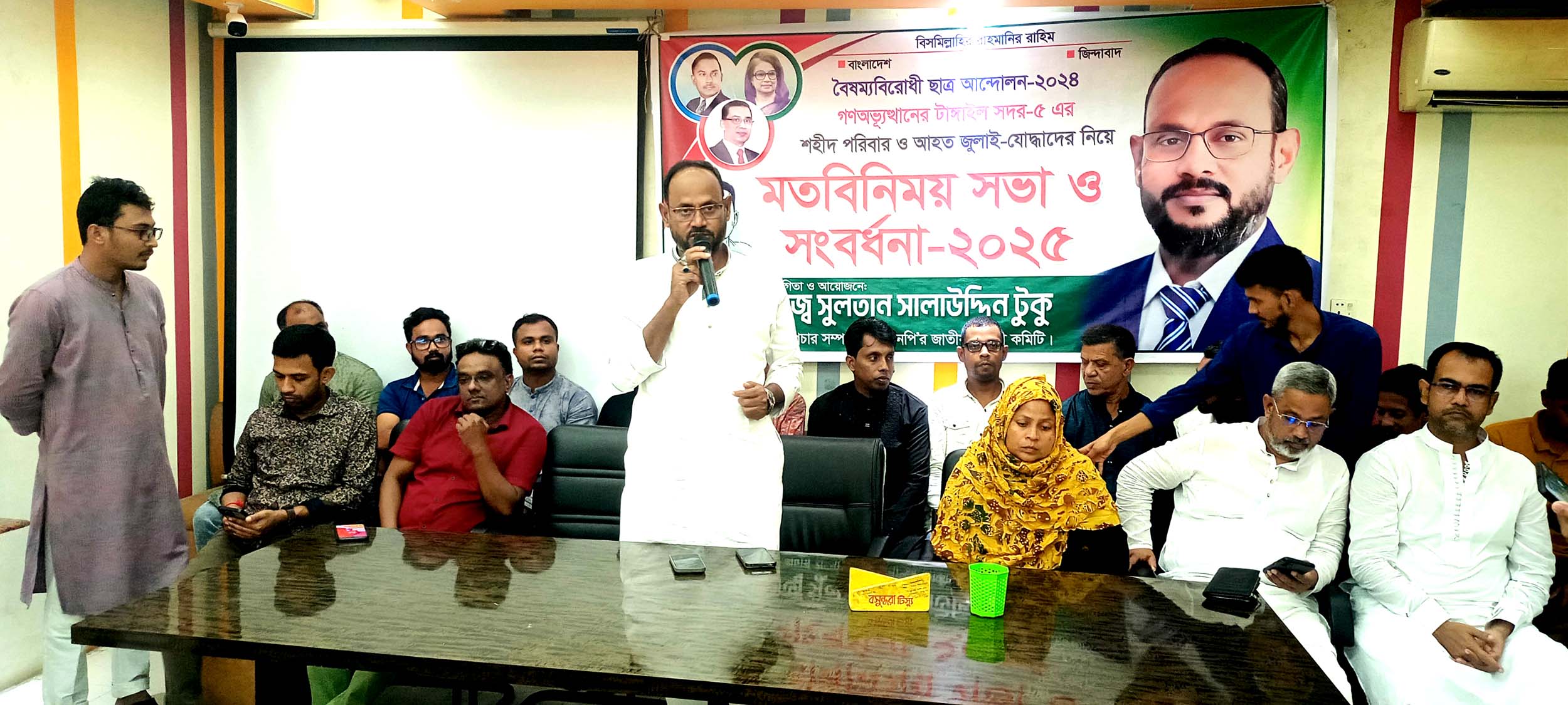 টাঙ্গাইলে বৈষম্যবিরোধী ছাত্র আন্দোলন গণঅভ্যুত্থানের শহীদ পরিবার ও আহত জুলাই যোদ্ধাদের নিয়ে মতবিনিময় সভা করেছে জাতীয়তাবাদীদল বিএনপির প্রচার সম্পাদক সুলতান সালাউদ্দিন টুকু। শনিবার সন্ধ্যায় শহরের একটি রেষ্টুরেন্টে এ মতবিনিময় সভার আয়োজন করা হয়। এতে বক্তব্য রাখেন আহত জুলাই যোদ্ধা নবাব আলী, নিহত মারুফের মা মোরশেদা আক্তার প্রমুখ। এসময় জেলা বিএনপির সাবেক সদস্য সচিব মাহমুদুল হক সানু, সদর উপজেলা বিএনপির সভাপতি আজগর আলী, জেলা যুবদলের আহবায়ক খন্দকার রাশেদুল আলম, জেলা বিএনপির সাবেক সাংগঠনিক সম্পাদক শফিকুর রহমান খান শফিক, জেলা স্বেচ্ছাসেবকদলের সদস্য সচিব সালেহ মোহাম্মদ সাফি ইথেন, জেলা ছাত্রদলের আহবায়ক দুর্জয় হোড় শুভসহ বিএনপির অংঙ্গসহযোগী সংগঠনের নেতৃবৃন্দ উপস্থিত ছিলেন।